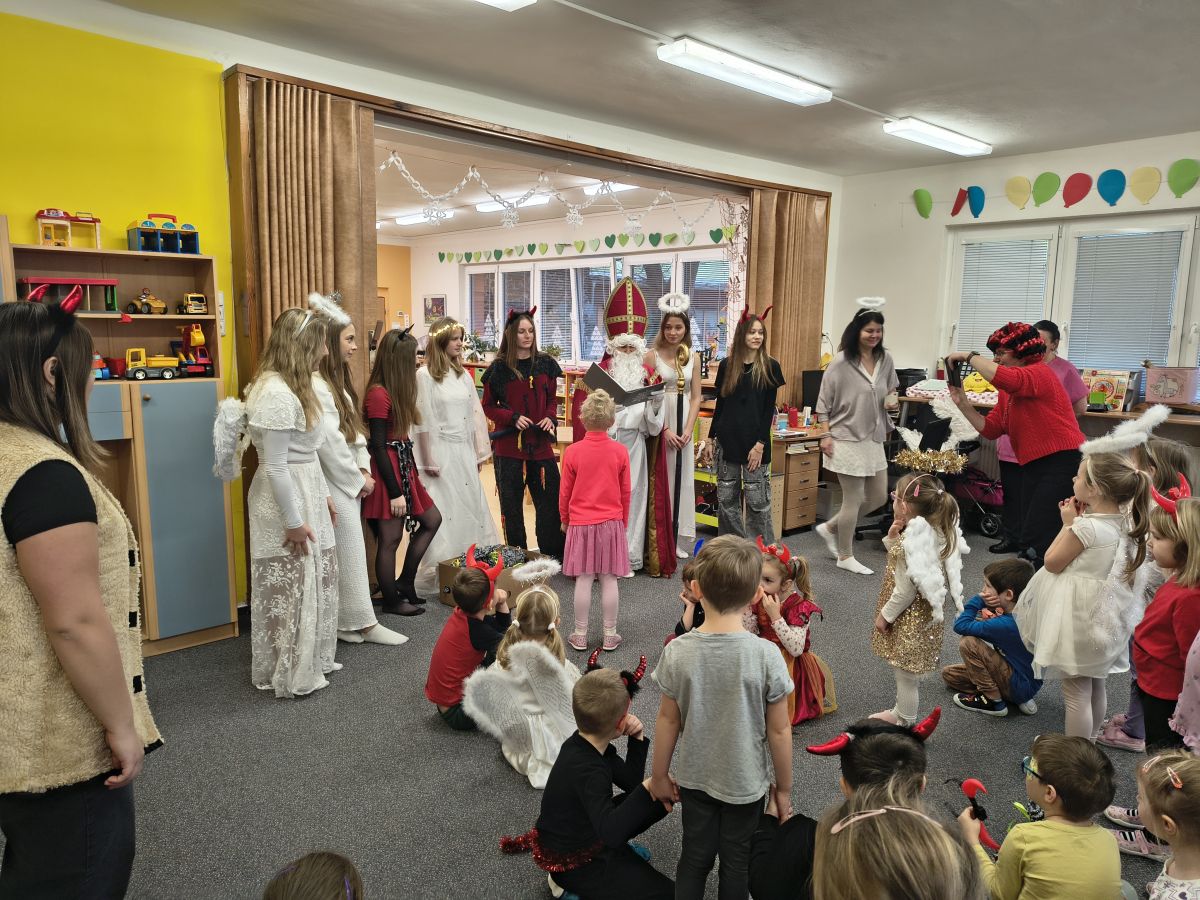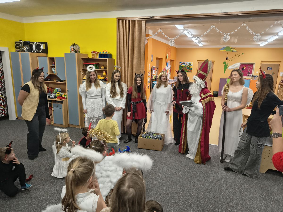 Mikuláš, čertík a anděl, žáci oboru Předškolní a mimoškolní pedagogika, navštívili děti v Mateřské škole Laurinka.