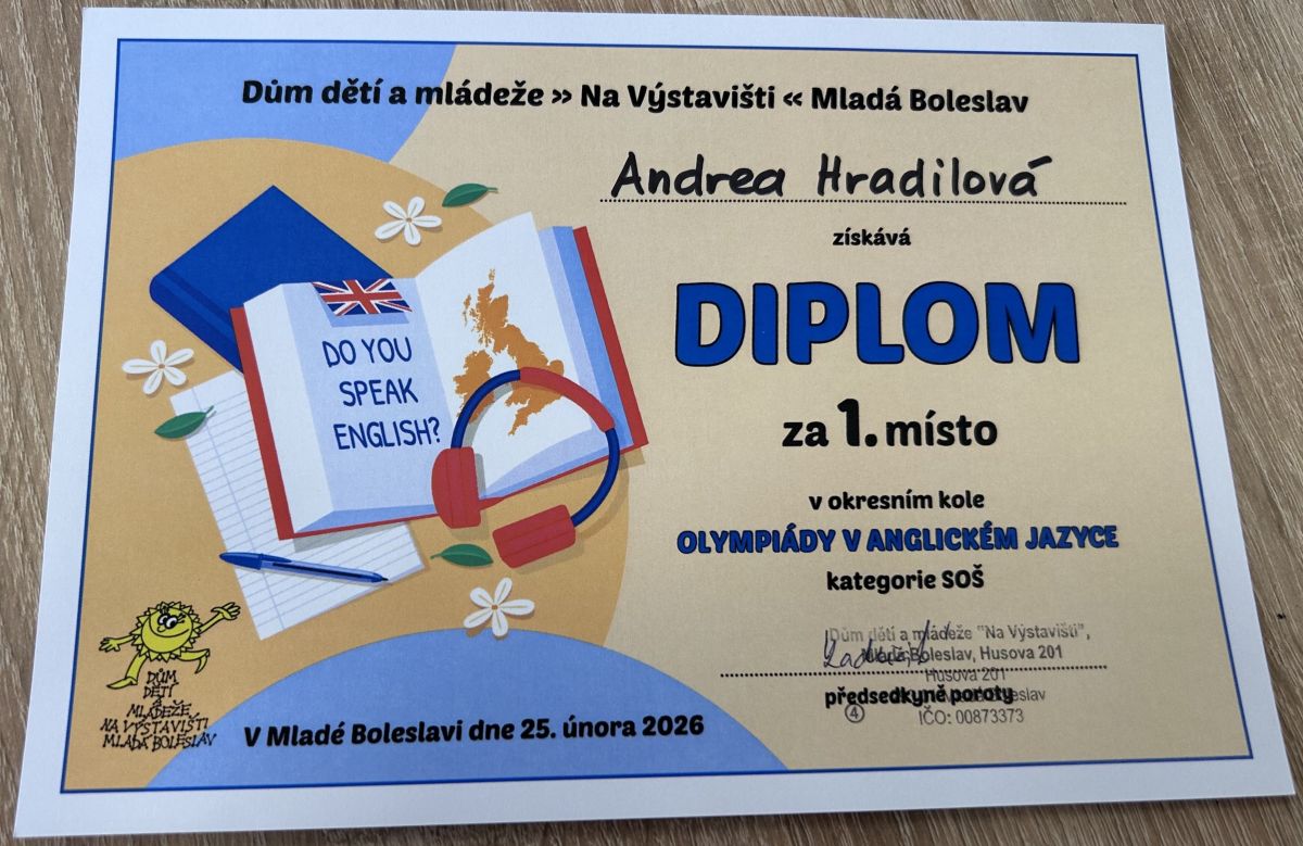Dne 25. 2. 2026 proběhlo v Domě dětí a mládeže "Na Výstavišti", Mladá Boleslav, okresní kolo olympiády v anglickém jazyce. Mezi více než dvacítkou účastníků se úplně neztratil nikdo z našich zástupců, ale všechny trumfla naše třeťačka Andrea! Zvládla písemný text i ústní část na výbornou a potvrdila, že angličtina je pro ni zkrátka „second nature“.